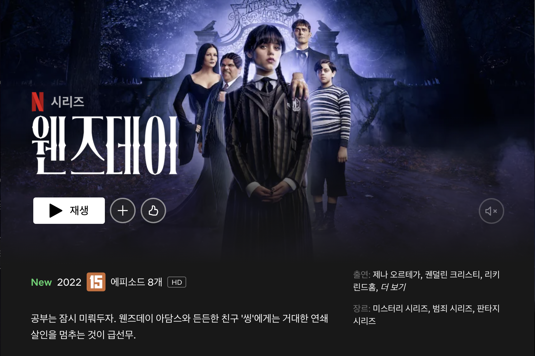 2022년 11월부터 방영된 미국 공포 코미디 시리즈로, 찰스 애덤스의 만화 <아담스 패밀리>의 캐릭터 웬즈데이 아담스를 주인공으로 한 시리즈입니다. 미스터리, 범죄, 판타지, 코미디의 장르로 총 8부작으로 구성되어 있습니다. 기획으로는 '알프레드 고프', '마일즈 밀러'이며, 연출로는 유명한 미국의 영화감독인 '팀 버튼' 감독입니다. 대표작으로는 영화 <베트맨>, <가위손>, <찰리와 초콜릿 공장>, <이상한 나라의 앨리스>, <미스 페레그린과 이상한 아이들의 집> 등이 있는 거물급 감독입니다. 주인공 '웬즈데이'의 배역으로는 미국 배우인 '제니 오르테가'로 출연작으로는 영화 <아이언맨>, <인시디어스> 등이 있습니다. 그 외에 인물로 '고메즈 아담스'역의 '루이스 구스만', '모티시아 아담스' 배역의 '캐서린 제타존스'가 출연합니다.