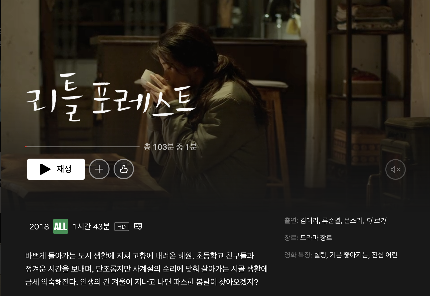 김태리 주연 작 중에 가장 인상 깊게 볼 수 있으면서 가장 김태리 다운 모습을 볼 수 있는 영화라고 생각됩니다. <리틀 포레스트>는 2018년 2월 28일에 개봉된 영화로, 러닝 타임은 1시간 43분입니다. 장르는 드라마, 가족으로 '임순례' 감독 작품입니다. 이가라시 다이스케의 <리틀 포레스트>의 원작을 기반으로 만들어졌습니다. '임순례' 감독의 작품으로는 <세 친구>, <와이키키 브라더스>, <우리 생애 최고의 순간> 등 다수의 작품이 있습니다. 주인공 '혜원' 역의 '김태리' 배우의 대표작으로는 <아가씨>, <미스터 션 샤이>, <스물 다선 스물하나> 등이 있습니다. 주인공 '혜원'의 친구 '재하' 역의 '류준열' 배우의 대표작은 <소셜 포비아>, <더 킹>, <뺑반>, <응답하라 1988> 등이 있습니다.