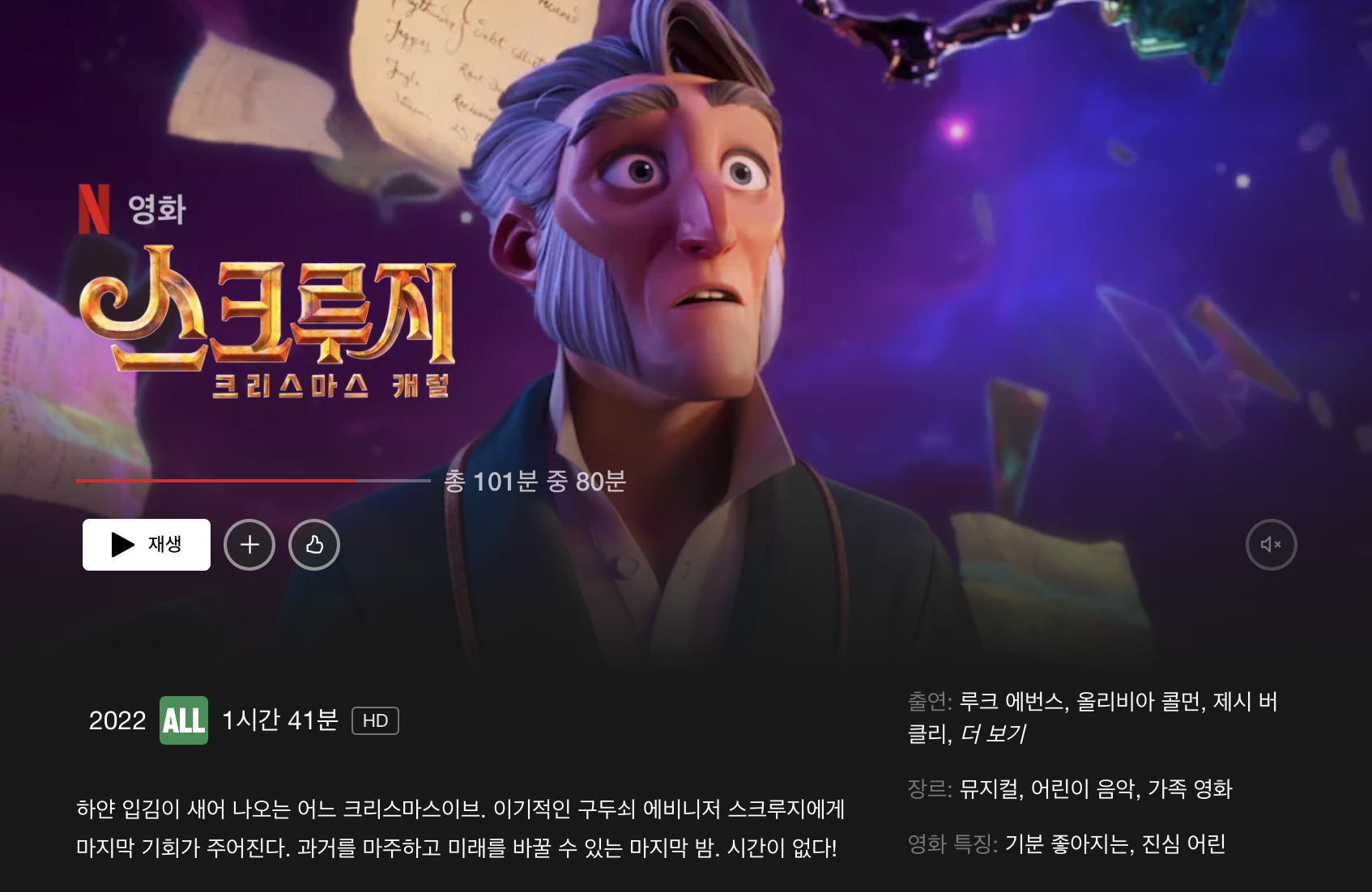크리스마스의 의미와 목적을 분명하게 말해줄 수 있는 애니메이션인 영화 <스크루지:크리스마스 캐럴> 은 2022년 12월 2일에 넷플릭스에서 개봉했습니다. 미국 애니메이션으로 러닝 타임은 1시간 40분입니다. 연출은 '스티븐 도널리' 감독이며, 출연진으로 '루크 에반스', '올리비아 콜맨', '제시 버클리', '조나단 프라이스', '자니 플린' 등이 있습니다. 영화 <스크루지:크리스마스 캐럴>은 1843년 '찰스 디킨스'가 출간한 소설 <크리스마스 캐럴>을 원작으로 만들어졌습니다. 주인공 스크루지는 어릴 적 가난한 형편으로 돈을 벌기 위해 살다가 평생을 돈만 바라보며 살아온 인물입니다. 결혼을 약속한 연인이 있지만 변해버린 스크루지를 떠나게 됩니다. 결혼을 하지 못한 스크루지는 조카가 맡긴 강아지 '프루던스'와 단둘이 살게 됩니다. 스크루지가 가장 사랑했던 여동생이 크리스마스에 아들을 낳고 죽게 됩니다. 그렇게 태어난 조카 '프레드'는 스크루지와 반대로 밝고 긍정적이며 베푸는 것을 좋아하는 인물입니다. 여동생을 죽게 만들었다고 생각한 스크루지는 프레디를 싫어하지만 프레디는 스크루지를 좋아하는 유일한 인물입니다. 마지막으로 스크루지의 유일한 직원인 '크래칫' 은 아픈 아들 한 명을 포함 한 일곱 명의 아이를 가지고 있지만 가난한 형편으로 살아가는 인물입니다.